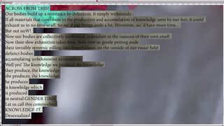 The plot: FOR AN ANONYMOUS FUGITIVE AUTHOR* (FAAFau) is the moderator of a fictitious panel. While FAAFau presents the panel the audience is watching a video in a form of a music album about the complicated (hierarchical) relationship between artistic production and institutionalized knowledge.
